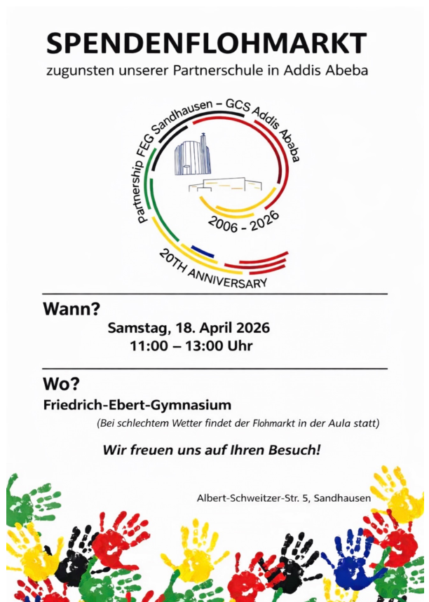 Seit 2006 verbindet das Friedrich-Ebert-Gymnasium und die German Church School in Addis Abeba eine einzigartige Partnerschaft. Jedes Jahr reisen Schülerinnen und Schüler nach Äthiopien, um gleichaltrige Partnerschüler zu treffen, die Arbeit in sozialen Einrichtungen zu erfahren und ein Land kennenzulernen, das ihre Sicht auf die Welt verändert.